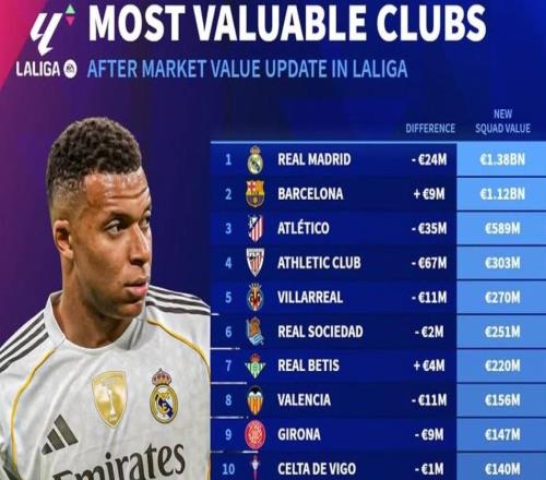 德转西甲俱乐部身价排名:皇马13.8亿第1,最低奥维耶多5840万