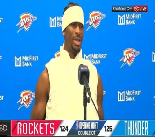 北京时间今日,在NBA新赛季揭幕战中,雷霆队在主场历经双加时以125-124击败了火箭队。赛后,雷霆队头号获胜功臣亚历山大出席了发布会。