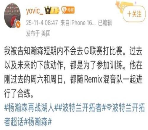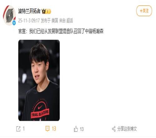 11月3日,@波特兰开拓者 官宣:我们已经从发展联盟混音队召回了中锋杨瀚森。