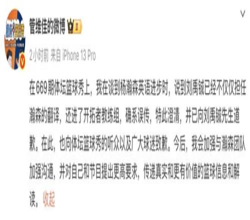 在669期体坛篮球秀上,我在谈到杨瀚森英语进步时,说到刘禹铖已经不仅仅担任瀚森的翻译,还进了开拓者教练组,确系误传,特此澄清,并已向刘禹铖先生道歉。在此,也向体坛篮球秀的听众以及广大球迷致歉。今后,我会加强与瀚森团队加强沟通,并对自己和节目提出更高要求,传递真实和更有价值的篮球信息和解读。