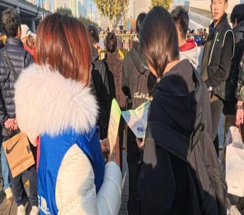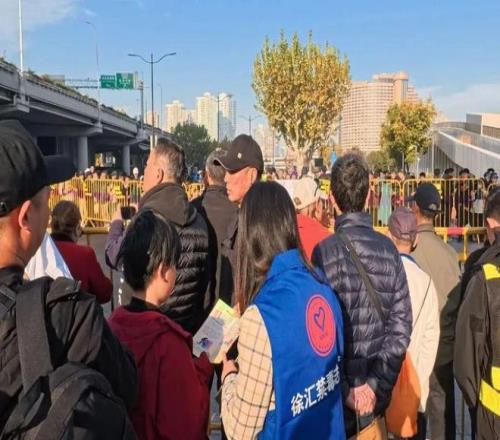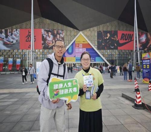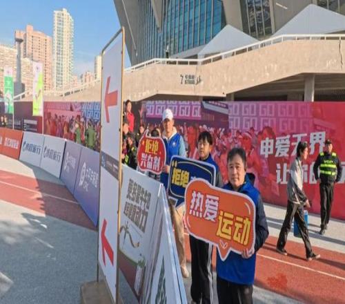 在徐汇滨江的跑道边,禁毒社工和市民一起为参赛选手加油!