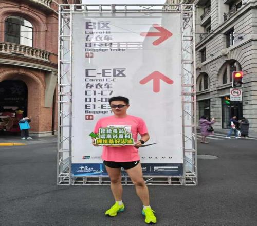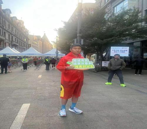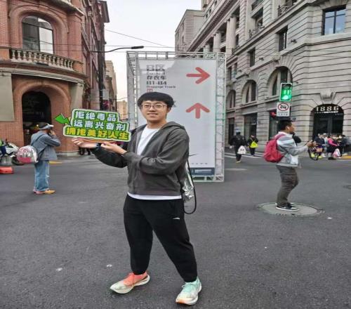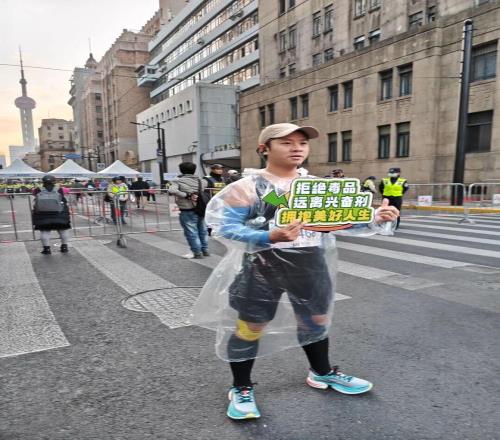 在黄浦区外滩滨江的晨光中,参赛选手手持“拒绝毒品 远离兴奋剂 拥抱美好人生” 的宣传标语牌,精神抖擞地开启征程。