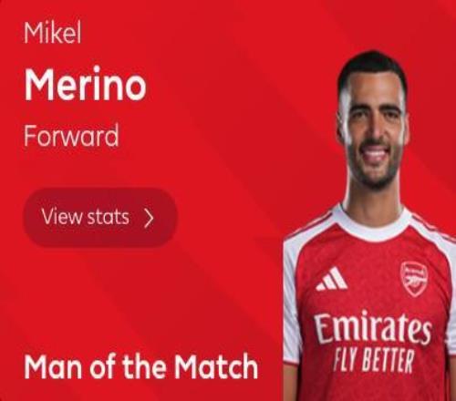 传射建功,梅里诺当选阿森纳vs小蜜蜂全场最佳球员