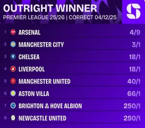相关机构列出了本赛季英超最新的夺冠概率,阿森纳居首,曼城、切尔西、利物浦前四的。